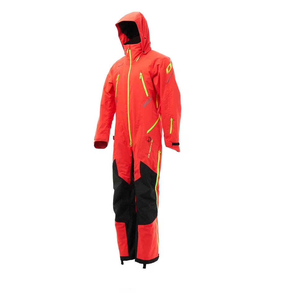 Центральная молния с тремя замками открывается сверху и снизу. Съемный капюшон имеет двойную утяжку. В помещении можно снять верхнюю часть комбинезона и воспользоваться регулируемыми лямками-подтяжками.